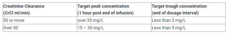 - Check peaks (1 hour post dose) and trough (end of dosage interval) within the first 48 hours of therapy and repeat 2-3 days thereafter. If renal function rapidly changing, check more frequently.