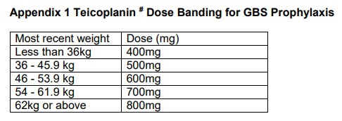 Teicoplanin 12mg/kg 12 hourly for 3 doses then 24 hourly until delivery.