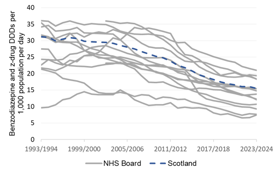 Chart 1: NHS board benzodiazepine and z-drug prescribing by defined daily dose (DDD*) per 1000 list size per day