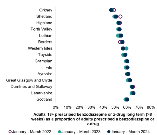 B-Z prescribing has reduced over the years in Scotland (see Chart 1, below)). Chart 2 shows less than 6% of adults receiving B-Z in 2023/24. Long-term (≥8 weeks) use remains common with over 40% of adults receiving B-Z remaining on treatment long-term (Chart 3 Jan-March 2024). This is outwith medicine licensing and runs contrary to current guidelines and prescribing advice.5,13,15