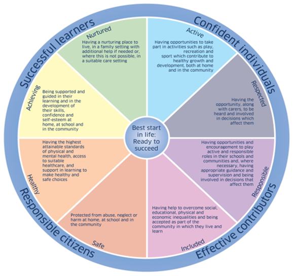 Wellbeing is considered and assessed across the aspects of children and young people being Safe, Healthy, Achieving, Nurtured, Active, Respected, Responsible and Included. These are the wellbeing indicators as referred to within section 96(2) in Part 18 of the Children and Young People (Scotland) Act 2014.