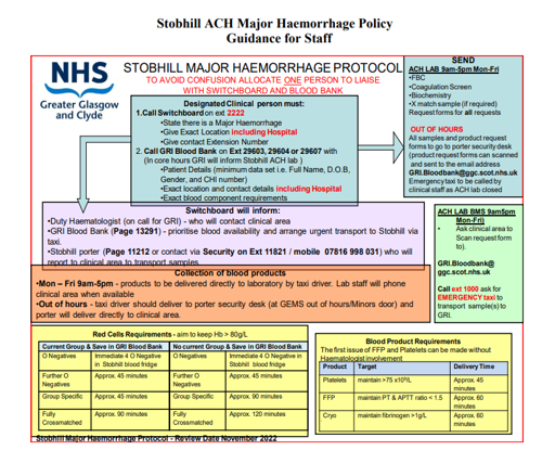2. Call GRI Blood Bank on Ext 29603, 29604 or 29607 with (In core hours GRI will inform Stobhill ACH lab)