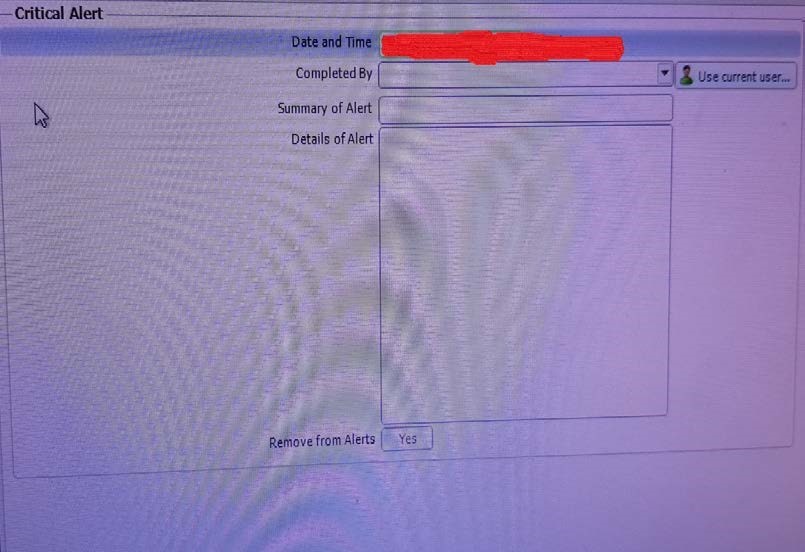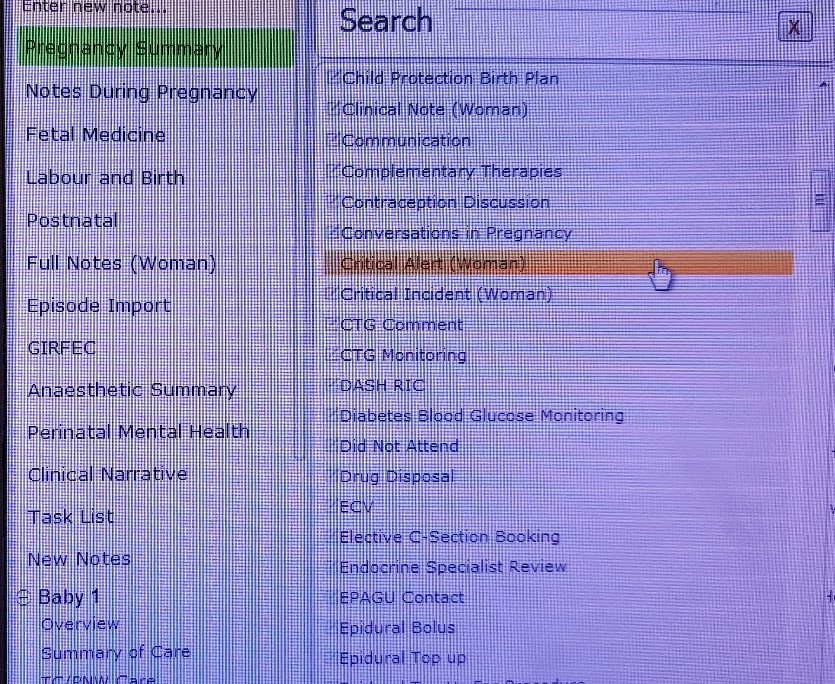 To enter a Critical Alert-Woman please search under the ‘Enter new note tab’ (See Picture 1) Complete the boxes (See Picture 2) detailing the details of the alert e.g. Bicornate uterus at EPAS scan.