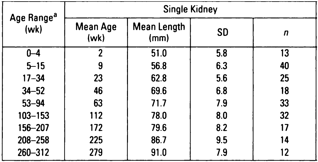 Compensatory hypertrophy of the remaining solitary kidney can be defined as growth above the 50th centile (length) for age and height. Alternatively, Rottenberg et al produced normograms for kidney length, by age in children with a single kidney (see table below).