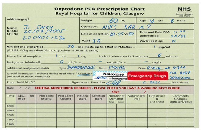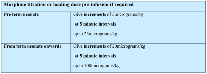 Morphine/Oxycodone syringe should be prepared as 1mg/kg in 50mls 0.9%saline º20micrograms/kg/ml; maximum 50mg in 50mls