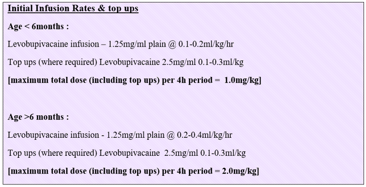 Direct infiltration of a wound with LA blocks noxious afferent pain pathways, and can provide anaesthesia without risks or complications of neuraxial blockade.  Catheters can be placed in any surgical wound and in RHC, catheter through needle kits are available (PAJUNK) in a variety of sizes.  Catheters used can be 100mm, 150mm and epidural catheters.  The catheters are multi-holed and the system is designed to infiltrate uniformly across the length of the holes.  The entire length of the perforations should be within the wound, to avoid significant leakage.  The catheters are inserted in theatre and under direct vision by the surgeons.  The responsible anaesthetist then fills the PAJUNK elastomeric pump as per RHC Guidelines below: