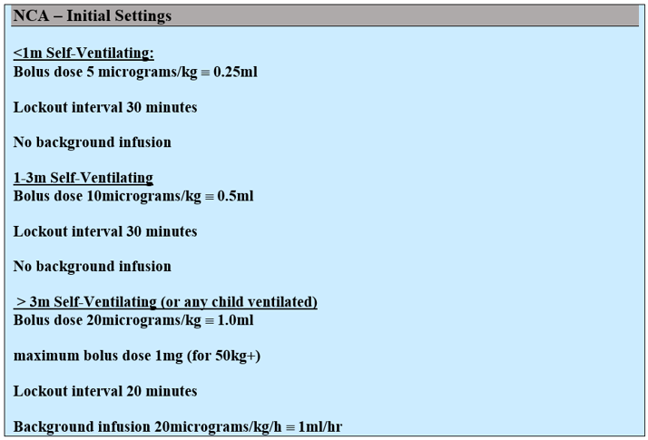 Infusion only opiates are used almost exclusively in PICU and NICU.  The settings below can also be used as a guide to initial background infusions for PCA/NCAs