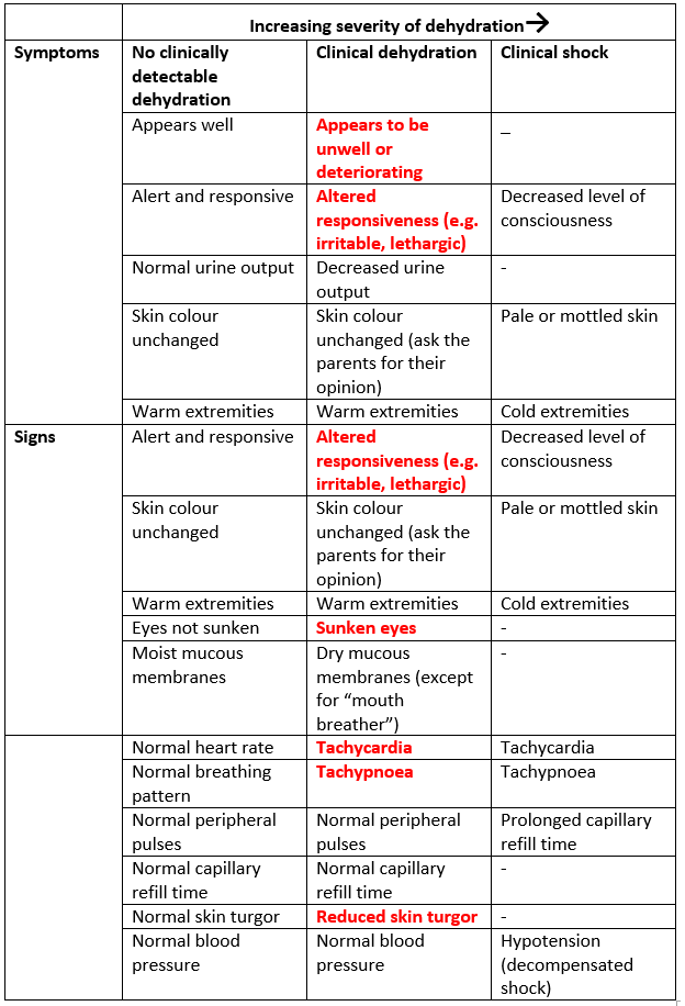 Management Plans for children with no dehydration, clinical dehydration, and shock are based on WHO guidance for the management of severe dehydration1, with IV fluid management based on NICE guideline NG29 and ESPGHAN Guidelines2,3. For discussion of the basis of IV fluid recommendations see section 3.5.
