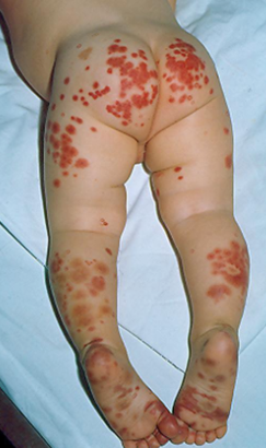 • Classical symmetrical distribution of palpable purpura - predominantly over the child’s buttocks, lower limbs and ankles