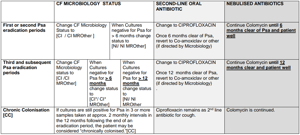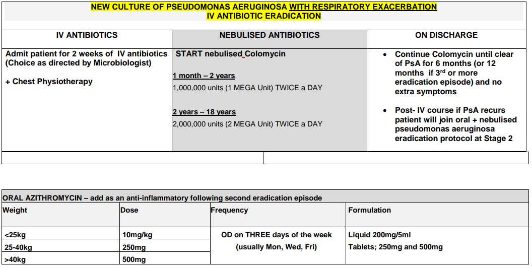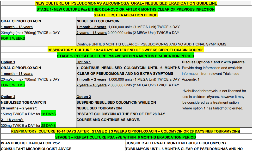 Recommendation: When P. aeruginosa grows from respiratory culture for the first time (or where there is growth in a patient that has been clear of the organism for 6 months or more) eradication should be attempted.2