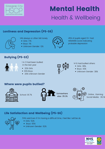 There are Mental Health and Wellbeing School Practice Guidelines available to all schools in Glasgow and accessible via Go Glasgow.  These practice guidelines provide information for establishments to support understanding around MHWB for children and young people and recognising the crucial role of education staff.