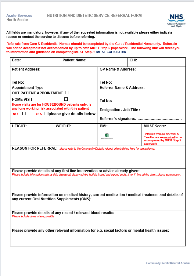 Please note clinical referrals to Dietetics from care homes need to also include a completed MUST Step 5 form to complete the referral process.