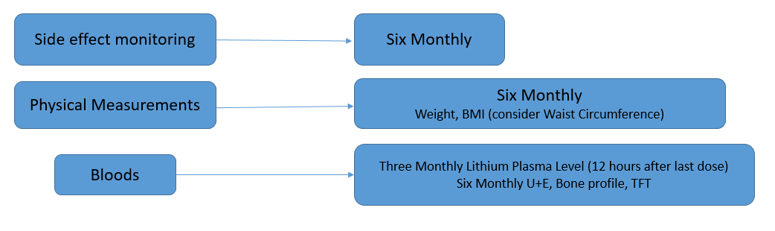 A recent BMJ article outlined guidance for monitoring drugs in people with bipolar disorder and supports the local discussion and agreement: Zaidi SHeald A HBelgamwar R BFryer A AMonitoring drug interventions in people with bipolar disorder