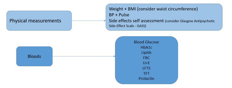 Antipsychotics should NOT be commenced by Primary Care.  Should GPs choose to commence prescribing of antipsychotics, bloods should be carried out at baseline, after three months, annually and following any dose change. ECG should be carried out at baseline and following any dose change.