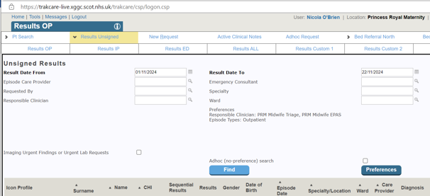 - In the results preferences page select your reviewing area (e.g PRM Midwife EPAS, QUEH Midwife Triage) under the ‘Responsible Clinician’ field and select ‘Update’.