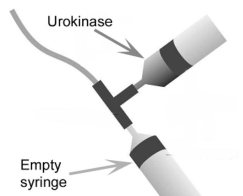- Maintain suction with one hand and with the other hand turn stopcock so it is closed to the syringe containing thrombolytic which will be sucked into the catheter. Don't worry if it seems that that very little thrombolytic is sucked in - even a tiny volumes will reach several cm into the catheter.