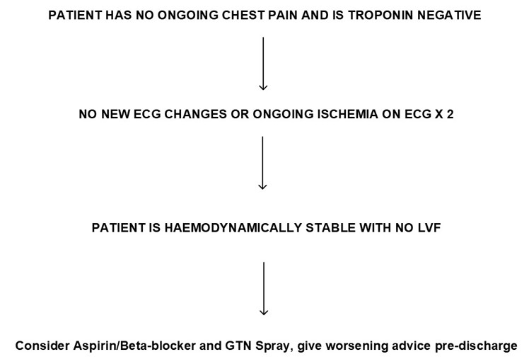 Patients who have been admitted with chest pain of unknown origin but POSSIBLY CARDIAC may be discharged while waiting further investigation or follow up if the following criteria are met: -