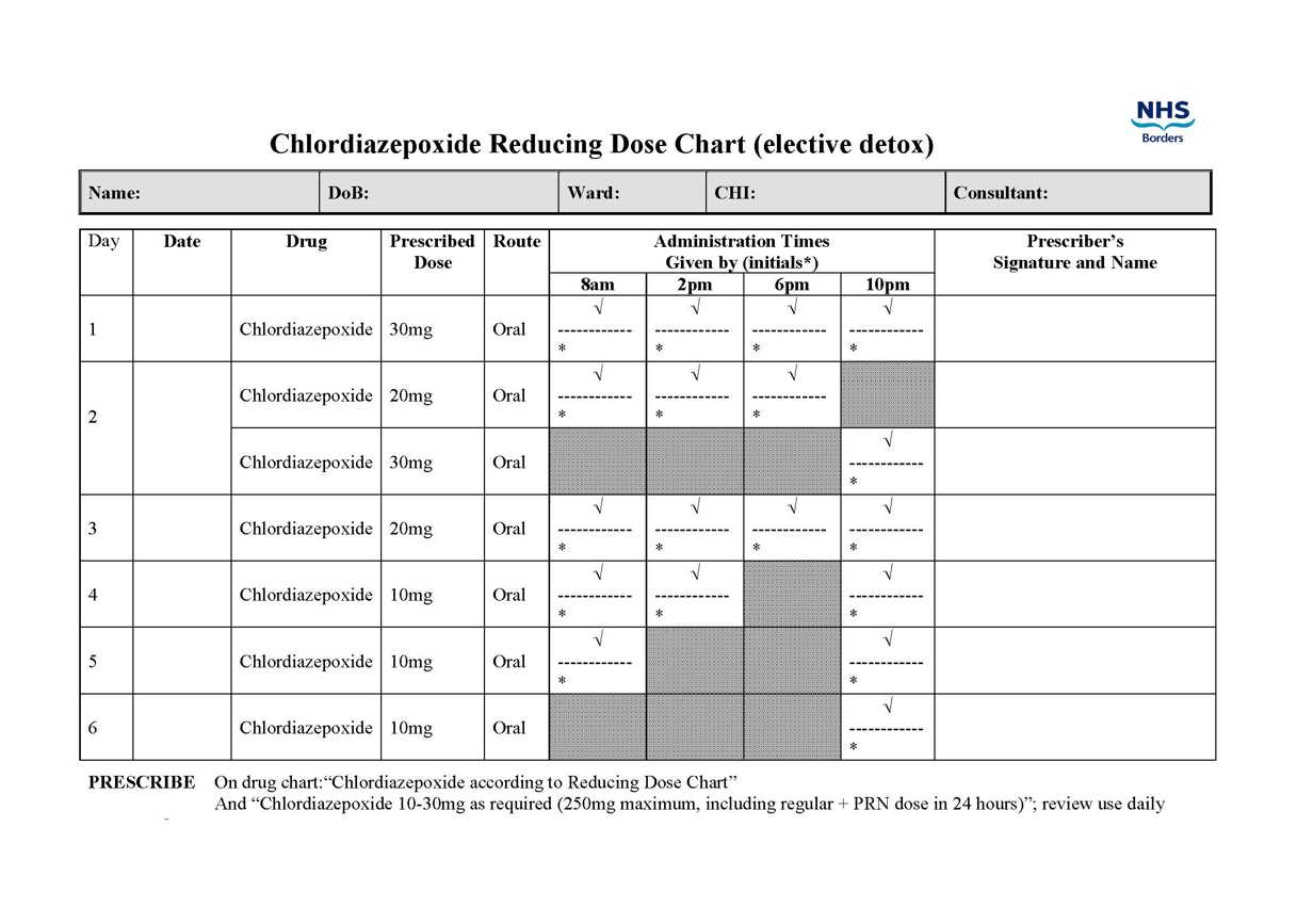 Some patients, especially at the start of the detox, may struggle and need to repeat a previous day, for example restarting and repeating day one (chlordiazepoxide 30 mg QDS) the day following admission. There should be a low threshold for doing this, alongside allowing more liberal usage of PRN in the first 3 days. This is the highest risk period of the detox and more liberal chlordiazepoxide use lowers the risk of seizures or delirium tremens (DT’s) developing.