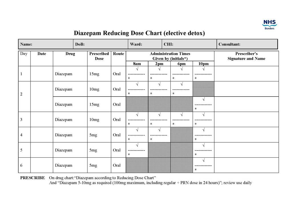 Diazepam can be used as an alternative to Chlordiazepoxide. It has a longer half-life than Chlordiazepoxide and can be more prone to accumulation and toxicity. It should only be used in place of Chlordiazepoxide where this has been specially requested by BAS. It should not be used where there is severe liver impairment. Diazepam 5 mg is approximately equivalent to 12.5 mg of Chlordiazepoxide. In addition to the reduction regime in Appendix 4 an as required dose of Diazepam 5 – 10 mg should be prescribed, total maximum of 100 mg in 24 hours.