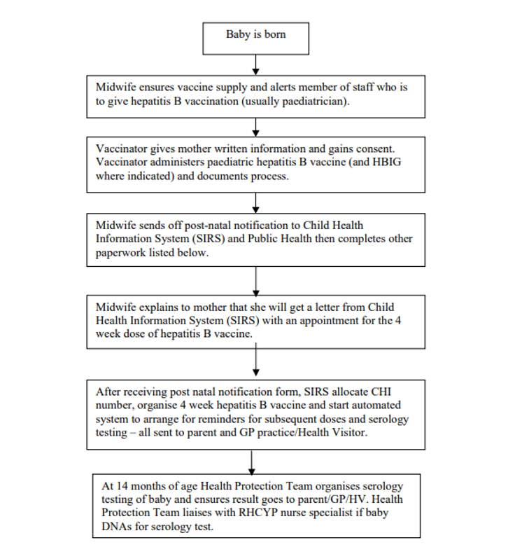 The first dose of monovalent hepatitis B vaccine should be administered by hospital staff within 24 hours of birth and before the baby is discharged from hospital. Subsequent doses will be given by community vaccination teams, or paediatric team if the baby stays in the neonatal unit or paediatric unit beyond 4 weeks of age. If a Hepatitis B infected mother chooses to have a home birth, HPT will work with the Midwives to ensure the baby is vaccinated at birth.