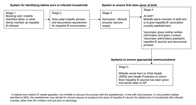 Note: In very preterm babies admitted to NNU, the paediatrician may decide for clinical reasons to postpone the dose of hepatitis B vaccine for babies born to households with infected member (other than the mother) until just prior to discharge.