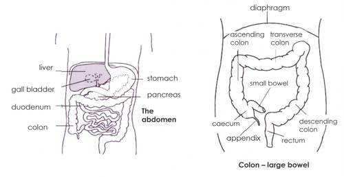 The bowel is a tube of intestine which runs from the stomach to the back passage. The lower half of the bowel is called the colon. This runs up to the right ribs and loops across the upper part of the belly. Then it passes down the left side to run backwards into the pelvis towards the back passage. This is called the rectum.