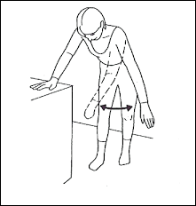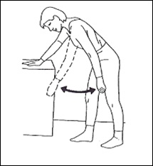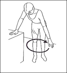 Bend from your waist and gently hang your arm in front of you. Rest your other hand on a table or chair for support and balance.