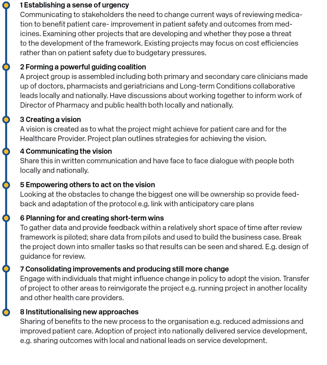 The core foundation of Polypharmacy Guidance, Realistic Prescribing 2018 approach remains the holistic patient centred 7-Steps medication review. However, once embedded, the principles should be considered at all critical stages of the medication use process: prescribing; reviewing; dispensing; communicating and reconciling. This is of particular importance at initiation of treatment in order to support shared decision making between the patient (and/or carers, and/or welfare proxies) and clinician.