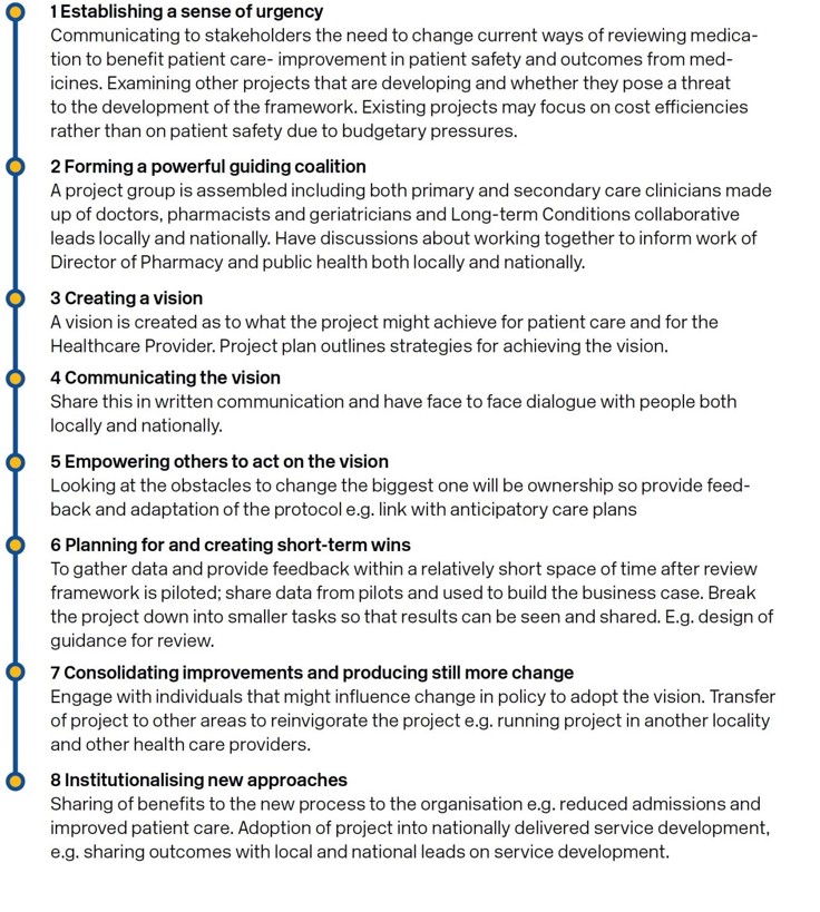 Boards and IJBs should consider this information alongside the data provided by the indicators (Appendix F) and identify a lead within the medicines management team and a local clinical lead, geriatrician or GP. These two leads should work together to drive delivery and implementation of the recommendations within this document, ensuring that the primary and secondary care interface is appropriately developed.