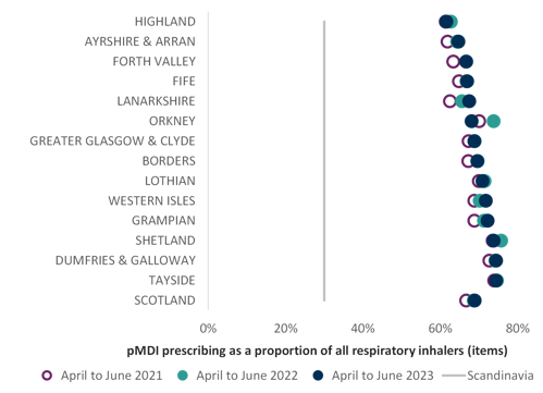 - The chart below shows the proportion of pMDIs dispensed as a proportion of all other inhalers (including dry powder inhalers and soft mist inhalers). As detailed above, the UK has a high proportion of pMDI use (70%) compared with the rest of Europe (< 50%) and Scandinavia (10–30%).75 The grey line on the chart indicates the Scandinavian level of pMDI prescribing at 30% as a comparator.