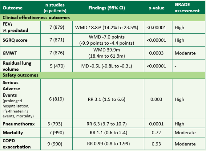 - A meta-analysis of four RCTs compared the Spiration® valve plus medical therapy with medical therapy alone or a sham procedure plus medical therapy in patients with severe or very severe emphysema. A sub-group analysis assessed the effects of the Spiration® valve in patients with little or no collateral ventilation. Results from the meta-analyses are summarised in table B. All statistically significant results (effectiveness and safety) favoured the intervention group.