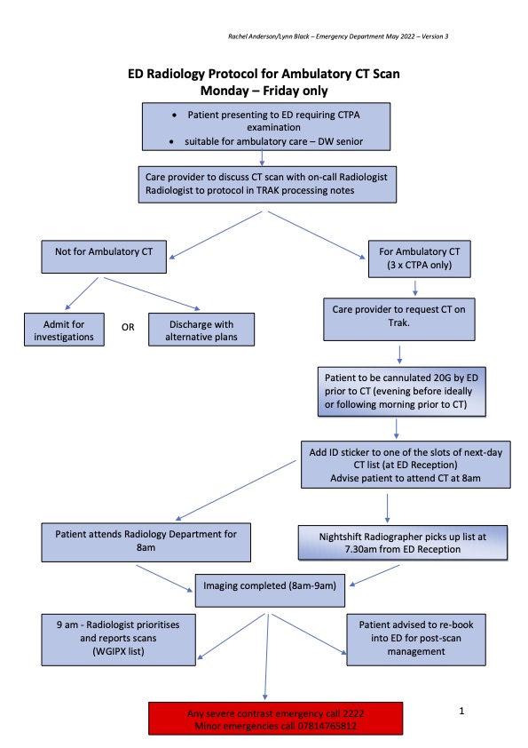 The following pathway diagram describes how to ambulate patients needing a CTPA. There is another page in the toolkit dealing with assessment of patients with suspected PE.
