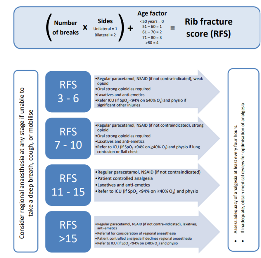 This guideline provides a framework for pain management for patients sustaining rib fractures whether sustained as a result of polytrauma or as a single injury. It acts as a reference for all parties involved in the care of these patients at Raigmore. It includes clinical strategies to reduce morbidity, including multimodal pain management, catheter-based analgesia, pulmonary hygiene, and discusses referral for operative stabilization.