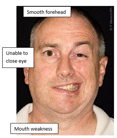 • Lower Motor Neurone facial weakness, ie, affecting the entire face (as opposed to Upper Motor Neurone weakness in stroke, which spares the forehead).