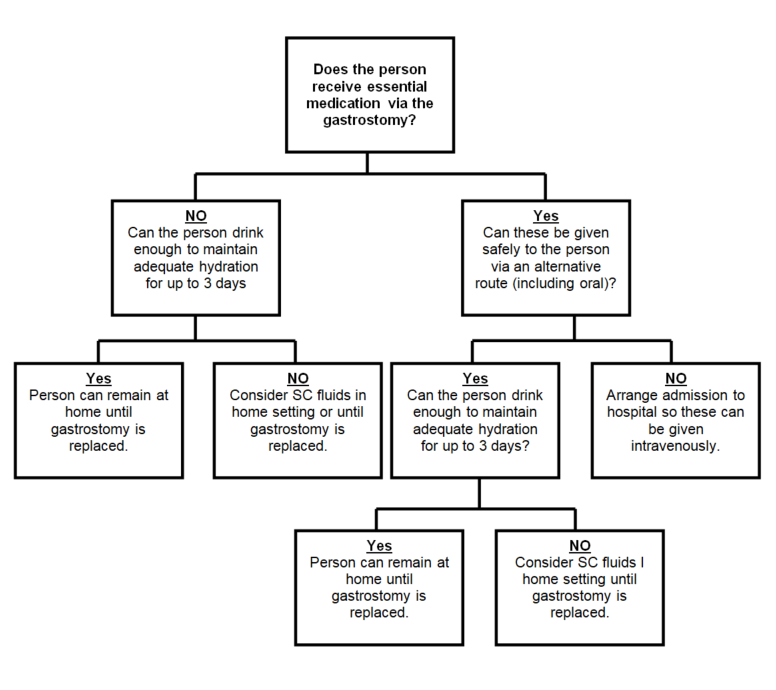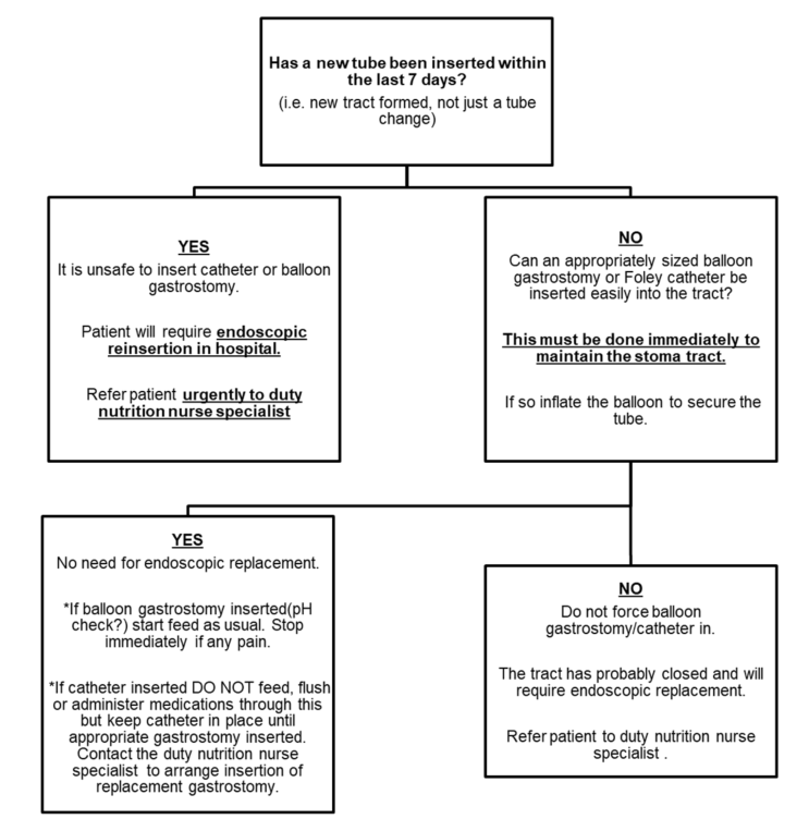 Appendices 1 and 2 provide guidance for the decision to start enteral feeding and the most appropriate route to use. All new enteral feeds should be initiated in a hospital setting and should expect to remain on the ward for at least 48 hours. See Complications of Gastrostomy Insertion section for a list of complications associated with gastrostomy placement.