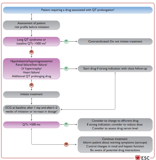 Some medications can affect the heart and cause QT prolongation. In susceptible individuals this can lead to ventricular arrhythmias and in some cases death. This flow diagram is intended for use by clinical teams who prescribe such drugs, full list found at CredibleMeds (see resources), to allow them to safely manage QT prolongation. QT assessment is not possible if there is QRS prolongation (eg RBBB/LBBB). QT assessment is less accurate at extremes of heart rate.