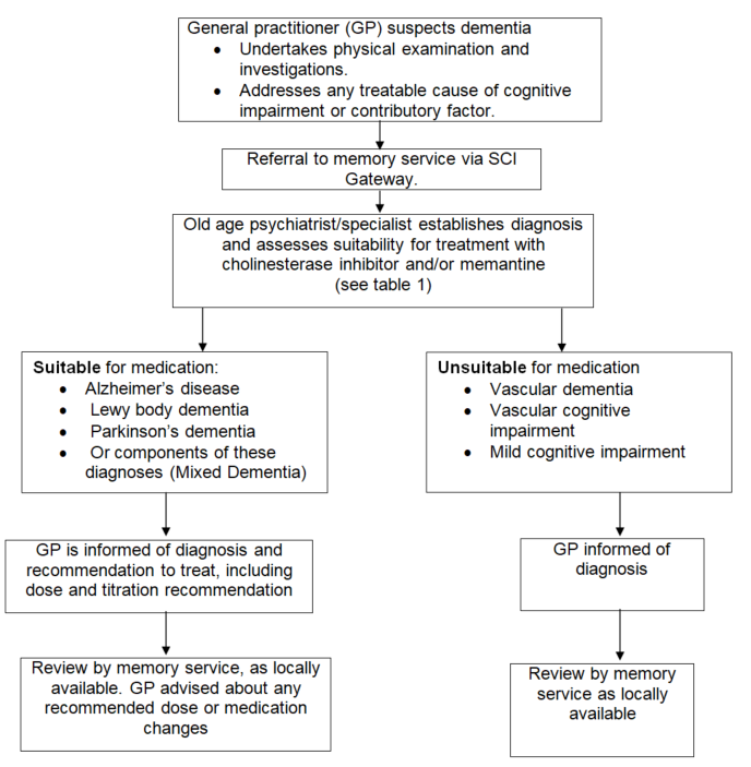 - Only consider AChE inhibitors or memantine for people with vascular dementia if they have suspected co-morbid Alzheimer's disease, Parkinson's disease dementia or dementia with Lewy bodies.