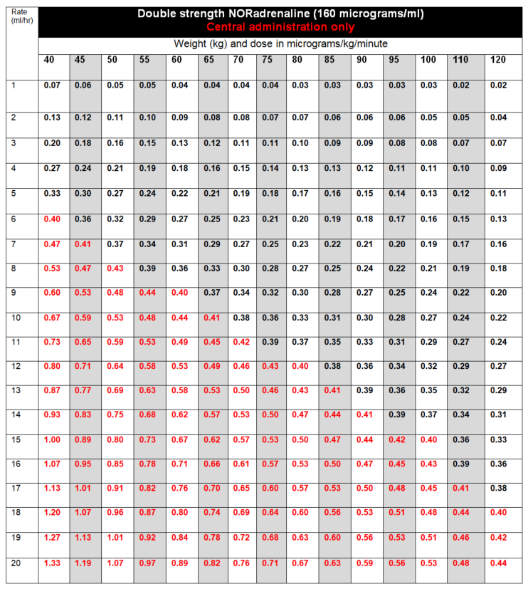 - If ready-to-use preparations unavailable, or preparing quad strength noradrenaline (16mg in 50mL, 320 micrograms/mL), dilute required volume of noradrenaline with glucose 5% to total volume and administer via syringe pump or volumetric infusion.