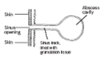 Discharging, blind-ended track that extends from the surface of the skin to an underlying abscess/cavity. May be caused by infection, liquefaction or a foreign body. |