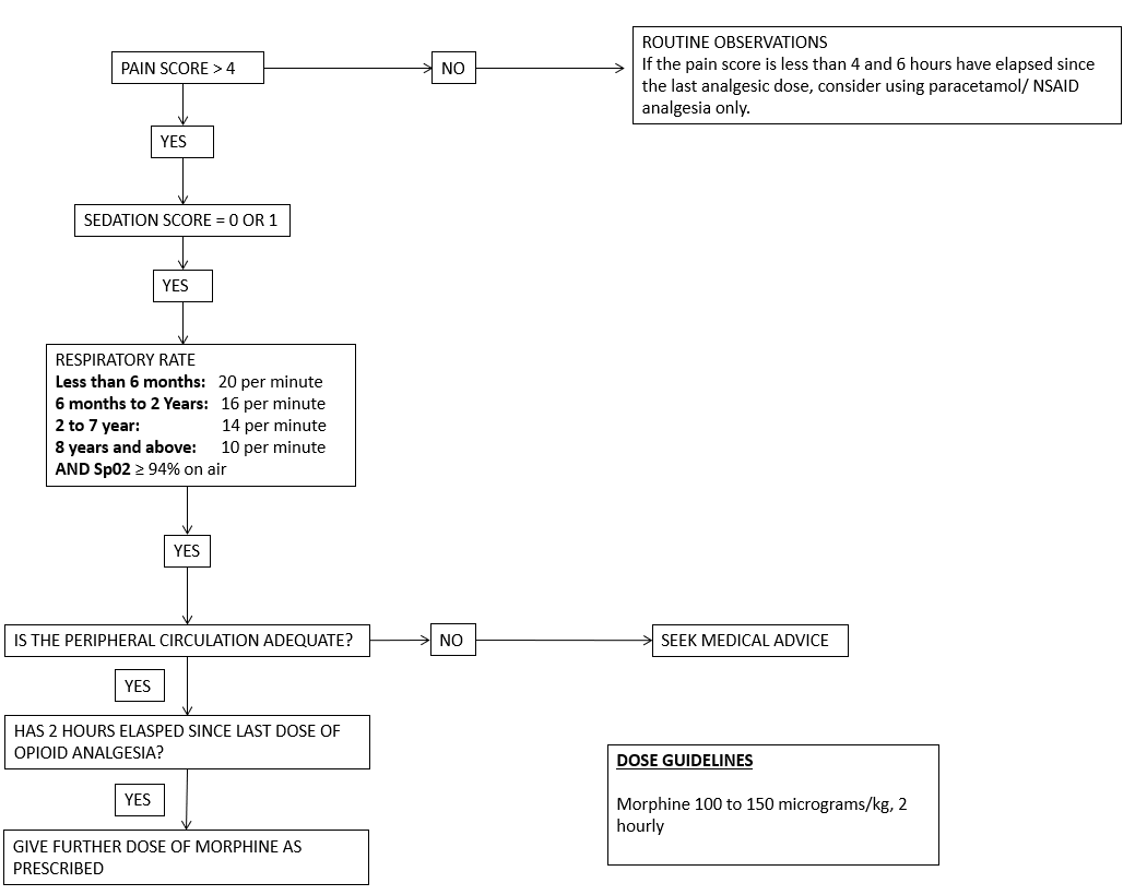 5. Reduce subsequent dose of opioid by half and assess if the child's pain can be managed with paracetamol and/or NSAIDS (oral/rectal).
